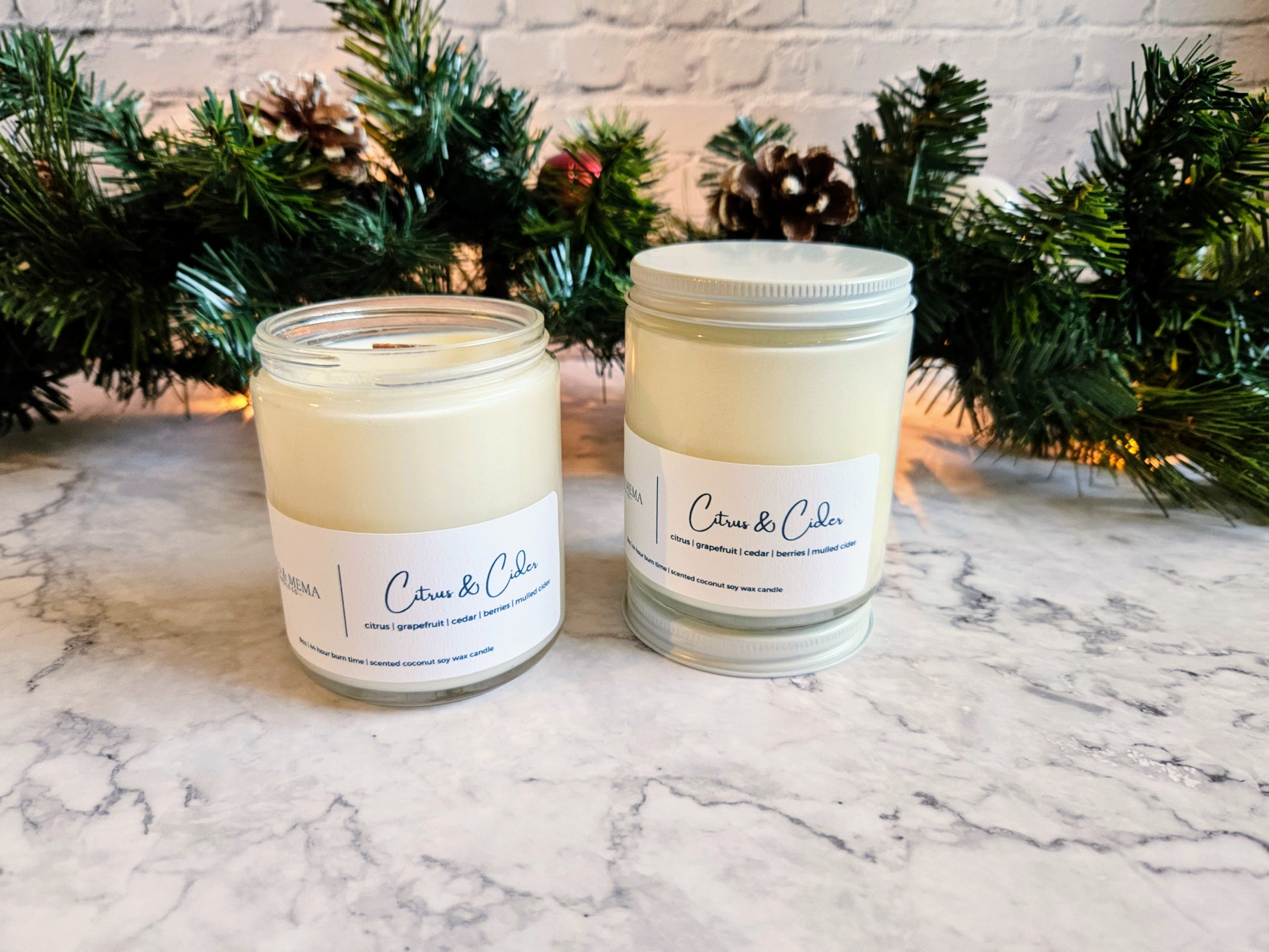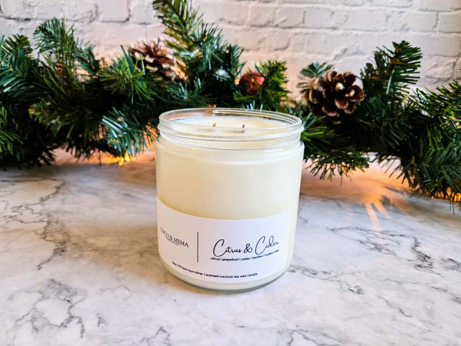 A delightful, festive aroma of mandarin, tangerine, and grapefruit, blended with balsam, cedarwood, berries, and spiced cider.